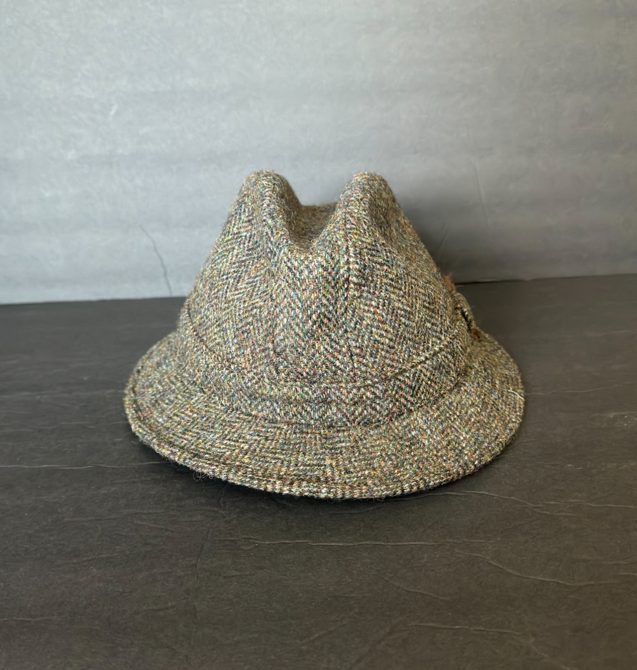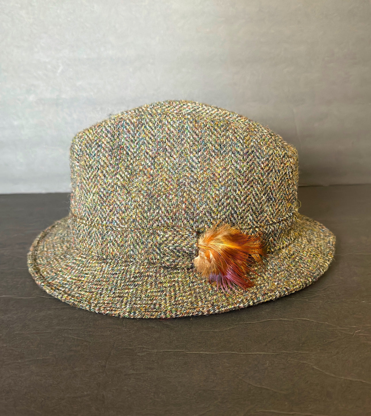 The structured body and brim ensure a secure and comfortable fit, whilst the decorative feathers on the brim complement the colourful flecks in the tweeds.